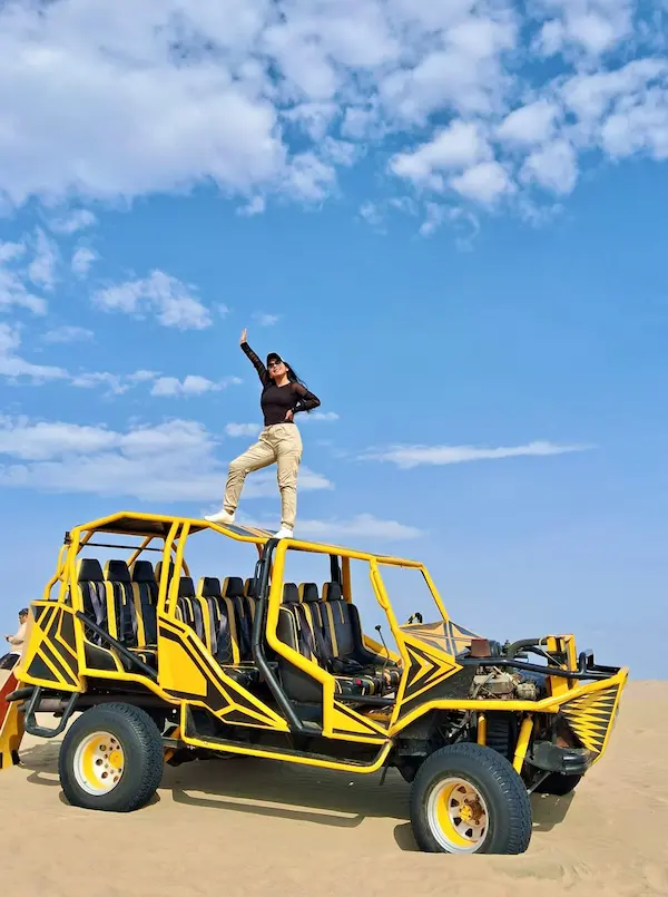 Adrenalina Pura: Buggies en Huacachina y Sandboarding Subiremos a los buggies (tubulares) para recorrer las dunas a toda velocidad en un circuito lleno de emoción. Durante el trayecto, haremos paradas estratégicas para practicar sandboarding (deslizamiento en tabla sobre la arena), apto para todos los niveles, desde principiantes hasta expertos.